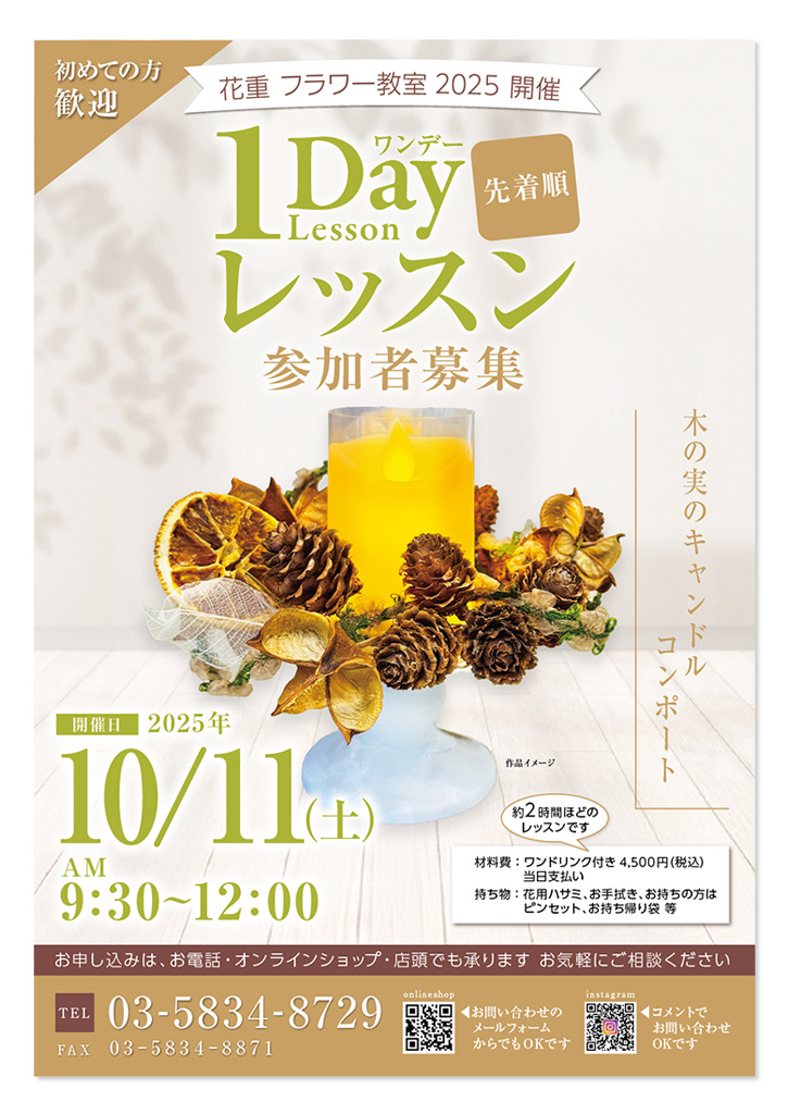 「1Day ワンデーレッスン」は、各約2 時間ほどのレッスン内容です。初心者の方はもちろん、お花に興味がある方など、この機会にぜひご参加ください。